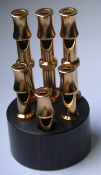 Das dunkle, polierte Grenadil harmoniert mit den Lichtreflexen auf der goldenen Oberfläche der Flötchen und den schwarz erscheinenden Aufschnitten. Der Ständer nimmt den 3-er Satz 3000/5000/8000 Hz auf und zusätzlich 3 variable Sensibilisierungsflötchen mit hervorstehender Stimmschraube. Auch sechs solche Flötchen können darin aufgestellt werden. Daten Durchmesser ca. 4 cm, Höhe ca. 2 cm 6 Bohrungen für Flötchen oder andere Objekte 3 kleine (ca. 4 mm) für variable Flötchen der Serie SEF V, 3 größere (ca. 8 mm) für Flötchen mit festen Frequenzen der Serie SEF 358 Gewicht : ca. 25 g Material: Grenadil, poliert |
