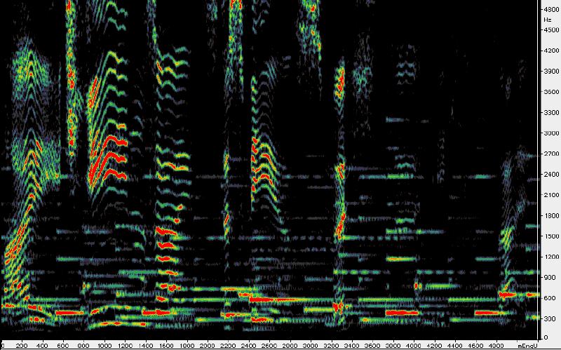 KLANGSTUKTUREN Heinz Stolze, eröffnet am 22.12.2006, überarbeitet am 15.8.2011 Die obige Graphik zeigt den subjektiv empfundenen Melodieverlauf der Sprechstimme über dem Notenbild an. Dabei werden lange Vokale durch mehrfache Wiedergabe ihrer Schriftzeichen angezeigt und am gesprochenen Laut orientiert gesetzt - etwa "a" statt "e" in "waaait" statt "weit". Für die Weiterentwicklung des Sprechens zu Musik ist es lohnend, den Melodieverlauf (genauer Grundtonverlauf) der Stimme und auch ihren Teiltongehalt objektiv zu bestimmen (Stichwort "Obertöne", genaueres dazu finden Sie im > Glossar Stimmtraining unter "Teilton" und "Spektrum"). Auf dieser Basis läßt sich das Hören für den Zusammenklang von Stimme und Instrument gezielt weiterentwickeln. Zunächst ist hier ein Sonagramm des Ausschnittes "weit jenseits des Meers möchte ich sein" angegeben. Die Teiltöne des Klaviers sind daran erkennbar, daß sie streng horizontal verlaufen. Man sieht, daß jeweils bei den "i"-Lauten (in "weit" und "jenseits") und auch bei "ee" die Stimme hochgelegene Teiltöne entwickelt (siehe unter Formant im > Glossar Stimmtraining), die über dem Bereich liegen, in dem das Klavier starke Teiltöne aufweist. Ganz allgemein ist es von Interesse festzustellen, wie sich die verschiedenen Vokale mit den verschiedenen Tönen des Klavieres verbinden können. Der Umgang mit solchen Klangverbindungen ist das zentrale Thema des Klangkontakttrainings ( > Klangkontakttraining). Eine ausführliche Erklärung, was ein Sonagramm ist, finden Sie unter > Sonagramm. Es ist interessant, das Sonagramm mit dem Gehörten zu vergleichen. Orientierung: Erster Bogen = "wei" / vertikaler Nebel dahinter in der oberen Hälfte = Rauschanteil des "t" / nächster Bogen = "jen" / Bogen in Bildmitte = "Meers" / Bogen am rechten Rand = "sein".
