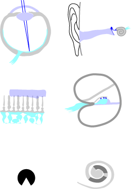 Der Schall gelangt über den Hörkanal zum Trommelfell, versetzt dieses in Schwingungen, die über die Gehörknöchelchen (Hammer, Amboß, Steigbügel) auf den Eingang der Schnecke im Innenohr übertragen werden. Dort werden sie in neuronale Impulse umgesetzt, die über den Hörnerv (rechts) weitergeleitet werden. |