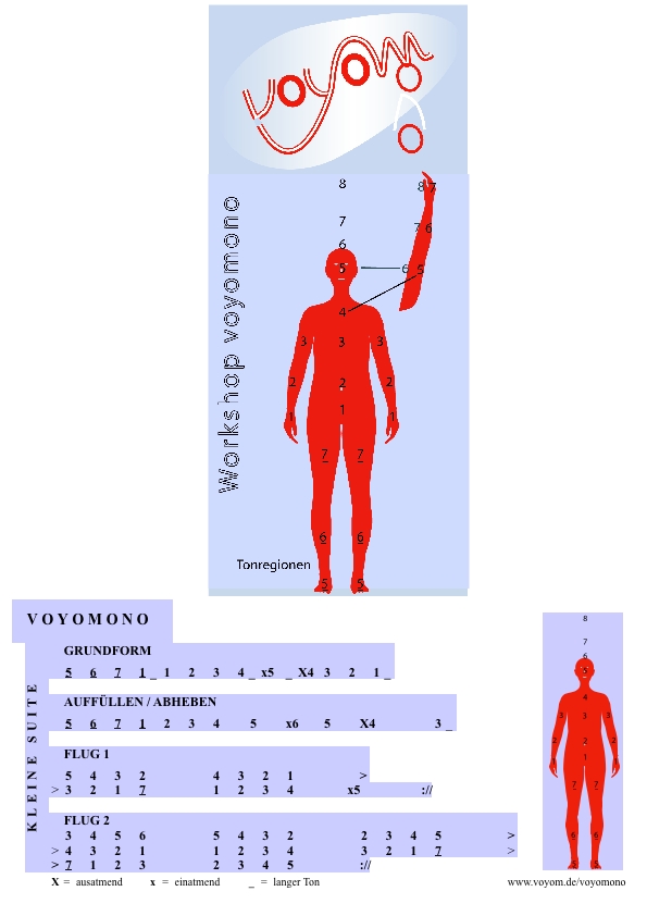 Es geht bei diesem voyomo darum, den Aspekt der aufrichtenden Kräfte zu verlassen und eine von Fuß bis zum Kopf und darüber hochziehende Leichtigkeitserfahrung zu machen. Hilfreich ist das Bild einer Flasche, die mit Wasser gefüllt wird, der Wasserspiegel steigt kontinuierlich hoch, bis das Wasser oben überläuft (auf x6, direkt über dem Kopf) und möglicherweise auch Verunreinigungen aus der Flasche auswäscht. Mit dem folgenden x5 X4 3 geht dann ein Bejahen dieses Prozesses einher, quasi ein mentales Eintauchen in den geistig gefüllten Körper von oben her bis zur Brust (Herz). Der Endton 3 führt zu einem offenen, schwebenden Ende. Die Übung macht offen für folgendes Handeln.