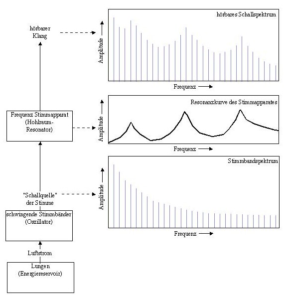 2.1: Die Aussage Die Funktion der Stimme wird wie folgt beschrieben: in den Vokaltrakt tritt eine primäre Schallwelle ein, die ein vorgegebenes Schwingungsspektrum hat und aus dem Mund tritt eine durch den Vokaltrakt modifizierte Welle mit entsprechend geändertem Spektrum aus, das dann die typischen Formanten aufweist (Abbildung, wie sie in vielen Lehrbüchern zu finden ist, i.w. nach J. Sundberg, 1988: Die Singstimme, in: Die Physik der Musikinstrumente, Spektrum-der-Wissenschaft-Verlagsgesellschaft, Heidelberg, p. 14-21). Der Vokaltrakt ist gekennzeichnet durch eine Filterkurve, die die Änderung zwischen Eintrittsspektrum und Ausgangsspektrum beschreibt. Die Resonanzen dieser Kurve bilden die Formanten aus. In vielen Büchern wird dieses Modell als ein physikalisches Modell der Stimmfunktion verbreitet. 2.2: Zum Sachverhalt 2.2.1 Energieerhaltung: Man muss sich zunächst klar machen, daß mit einem Amplitudenspektum nur der stationäre Fall beschrieben werden kann. Das heißt, das System ist eingeschwungen, es gibt keine zeitlichen Änderungen der Schwingungsamplituden mehr. Bezugnehmend auf die Überlegungen zur Energieerhaltung (unter Erratum 1. Verstärkung durch Resonanz) ist festzustellen, daß am Ausgang des Vokaltraktes nicht mehr Energie herauskommen kann als am Eingang hineingeht. Dies gilt für jede einzelne Frequenz. Also kann auf keiner Frequenz am Mund ein höherer Schallpegel austreten, als glottisseitig eintritt. Richtig ist: Der Energieübertrag von der "Quelle" an den Vokaltrakt ergibt sich im Zusammenspiel beider Systeme. Es läuft im stationären Zustand keinesfalls eine Schallwelle in den Vokaltrakt, deren Energie (auf den einzelnen Frequenzen) unabhängig von den akustischen Eigenschaften des Vokaltraktes allein durch die Quelle bestimmt ist. |