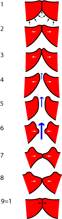 1: Stimmlippen geschlossen, Bewegungswende Wendemoment von vorhergehender Schließphase zu nun beginnender Öffnungsphase. Der Luftdruck von unten wirkt naturgemäß in alle Richtungen, die Krafteinwirkung ist somit tangential zu den Oberflächen (schwarze Pfeile). Die "Randkanten" erfahren eine Kraft nach oben. So kommt es zu einer Vertikalbewegung dieser Ränder (siehe Folgephasen 2,3). In der physikalischen Modellierung wird das im allgemeinen so beschrieben, daß die Stimmlippen als ganze sich horizontal bewegen und auf ihren Kanten zusätzlich eine "Welle" auf und ab läuft. In der nach unten konischen Öffnung hat die einwirkende Druckkraft (schräger schwarzer Pfeil) überall eine in horizontaler Richtung aufdrückende Komponente. 2: Öffnungsbewegung Die Stimmlippen bewegen sich voneinander weg (weiße Pfeile), der Durchgang (die Glottis) ist aber noch nicht geöffnet, da gleichzeitig eine Formänderung an den Rändern eintritt. Verformungen, die beim Aufeinandertreffen eintraten, bilden sich zurück, wobei zusätzlich der Druck von unten die Gestalt mitmoduliert. 3: Öffnungsmoment Moment, in dem die Glottis geöffnet wird, danach beginnt die Luftströmung nach oben. 4: Glottis offen, Stimmlippenbewegung weiter öffnend Die Strömung (blauer Pfeil) durch die Glottis ist "gut in Fahrt gekommen". 5: Wendemoment zur Schließbewegung Die Strömung durch die Glottis hat sich weiter beschleunigt, der Strömungskanal ist weiter aufgegangen. Die Luftströmung erzeugt nun einen erheblichen Sog (wie eine Wasserstrahlpumpe). Die Öffnungsbewegung ist zum Stillstand gekommen, die Schließbewegung beginnt. 6: Schließbewegung Die Randkanten bewegen sich nun in kleinen "Wellenhügeln" sehr schnell aufeinander zu. Dabei verengen sie den Strömungskanal, die Strömungsgeschwindigkeit darin erhöht sich, damit auch die Saugkraft, die die Schließbewegung der rechten und linken "Ausbeulung" entsprechend stärker beschleunigt. Der Strömungskanal wird noch enger, die Geschwingigkeit noch höher etc.. Da nicht die gesamte Stimmlippe mitkommt, muß nur eine kleine Masse bewegt werden, so daß auch deshalb die Bewegung sehr schnell werden kann. Voraussetzung ist dabei, daß die Bindung der hier vorschnellenden Schleimhaut an die Unterlage nicht zu fest ist. Eine gut bewegliche Schleimhaut führt ähnlich wie eine Gummidichtung zu einem sauberen und sehr schnellen Verschluß. Dieser wiederum führt zu kräftiger Lautstärke und einem starken Anteil an hohen Frequenzen im Schallspektrum. Diese geben der Stimme Helligkeit und Tragfähigkeit. 7: Schlußmoment Die Glottis ist jetzt (an dieser Stelle des Querschnittes) geschlossen. 8: Verbreiterung der Kontaktfläche Der massive Teil der Stimmlippen bewegt sich weiter aufeinander zu, die Kontaktfläche beider Stimmlippen vergrößert sich. 9=1 Stimmlippen geschlossen, Bewegungswende An der Kontaktfläche sind die Stimmlippen verformt, ähnlich wie ein Ball, der auf eine Wand aufgetroffen ist. Seine Elastizität führt zu Kräften, die die Verformung rückgängig machen und den Ball letztendlich von der Wand abstoßen. Wenn die Wand auch elastisch ist, wird sie ebenso verformt und entwickelt damit eine zurückstoßende Kraft. Dies ist auch bei den Stimmlippen der Fall. Je nach Konsistenz und Einstellung der Muskelspannungen verhalten sie sich mehr oder weniger elastisch. Die auftretenden Kräfte, die die Bewegungswende zum Öffnen hin mit einleiten, sind schwarz eingezeichnet. Hinweis: Diese Darstellung beschreibt das sogenannte Modalregister (Bruststimme), das von Erwachsenen üblicherweise zum Sprechen benutzt wird. |