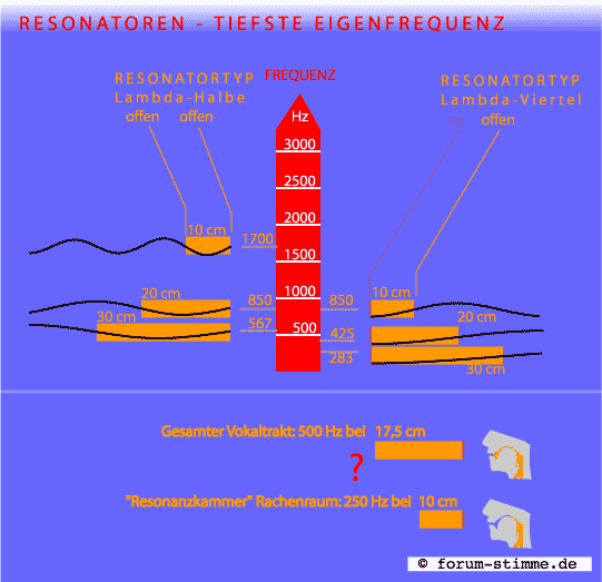 Das Bild soll anschaulich machen, welche tiefste Resonanzfrequenzen für typische Abmessungen im Vokaltraktbereich zu erwarten sind.