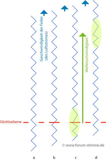 Die blau gezeichnete Spiralfeder stellt die Luft dar. Sie bewegt sich mit einer Strömungsgeschwindigkeit im Bereich von einigen Metern pro Sekunde nach oben (blauer Pfeil). Die Abbildung zeigt vier Zeitpunkte. a: Die Stimmlippen sind offen, die Feder schiebt sich nach oben (=Luft strömt nach oben). b: Die Stimmlippen haben gerade geschlossen. Die Bewegung der Feder in der Glottisebene ist blockiert. Da die Feder in Schwung ist, bewegt sie sich oberhalb und unterhalb der Glottisebene weiter. Dabei kommt es unterhalb zu einer Stauchung, oberhalb zu einer Dehnung der Feder, erkennbar in der Zeichnung der folgenden Phase. c: Die Stauchung unten entspricht bei der Luft einer höheren Teilchendichte, also höherem Druck, die Dehnung oben entspricht einem erniedrigten Druck. d: Die Situation nach der Öffnung, nachdem die Feder als Ganzes gegenüber der Phase c ebenso viel weiter gerückt ist wie zwischen den vorherigen Phasen. Die Verschiebungsstrecke entspricht der Länge des blauen Geschwindigkeitspfeiles. Das Dehnungs-Stauchungs-Muster (grün-gelb markierte Zone) hat sich auf der Feder aber viel schneller ausgebreitet, es läuft als Welle nach oben (und nach unten - nicht dargestellt). Seine Geschwindigkeit ist die Wellengeschwindigkeit - in Luft ca. 340 Meter pro Sekunde. Das Federmaterial, das das Muster im Moment c bildete ist nur ein wenig nach oben gekommen, das Muster selbst wird nun aber von anderem Material viel weiter oben dargestellt. |