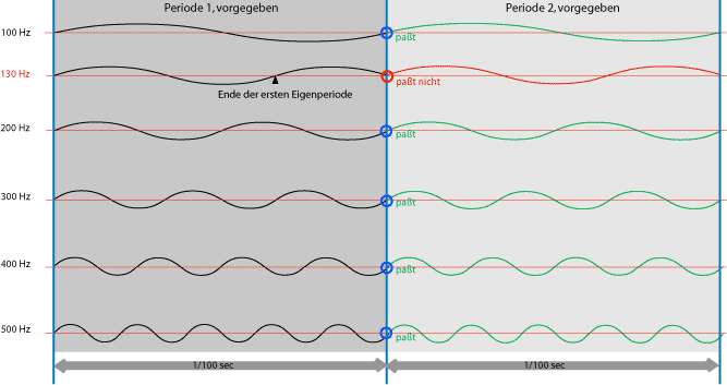 | Beispiel: die Periode ist 1/100 Sekunde. Eine reine Frequenz von 100 Hz (rein heißt ohne andere Frequenzanteile) hat einen sinusförmigen Verlauf, der sich nach 1/100 Sekunde wiederholt (oberste Kurve). Sie passt also in die Periodenstruktur - in Periode 1 ergibt sich derselbe Schwingungsverlauf wie in Periode 2. Eine Frequenz von beispielsweise 130 Hz (zweite Kurve von oben) passt nicht hinein. Sie durchläuft ihre eigene Periode so schnell, daß sie schon vor Beginn der vorgegebenen Periode (= 1/100 sec) beginnt, sich zu wiederholen. So startet sie in die neue vorgegebene Periode anders als in die erste. Damit verletzt sie die vorgegebene Periodizität.